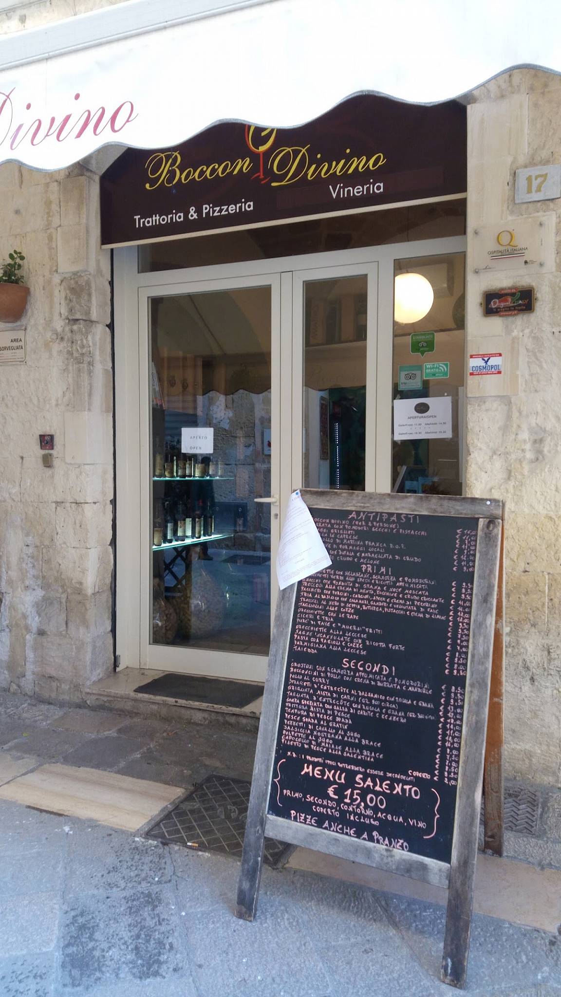 Dal menu salentino alle pizze, dai primi ai secondi, fino alla selezione di vini e birre, la proposta del Boccon Divino è pensata per offrire varietà senza perdere identità. Una tavola adatta a chi cerca il gusto della tradizione e a chi vuole semplicemente mangiare bene, nel cuore di Lecce.